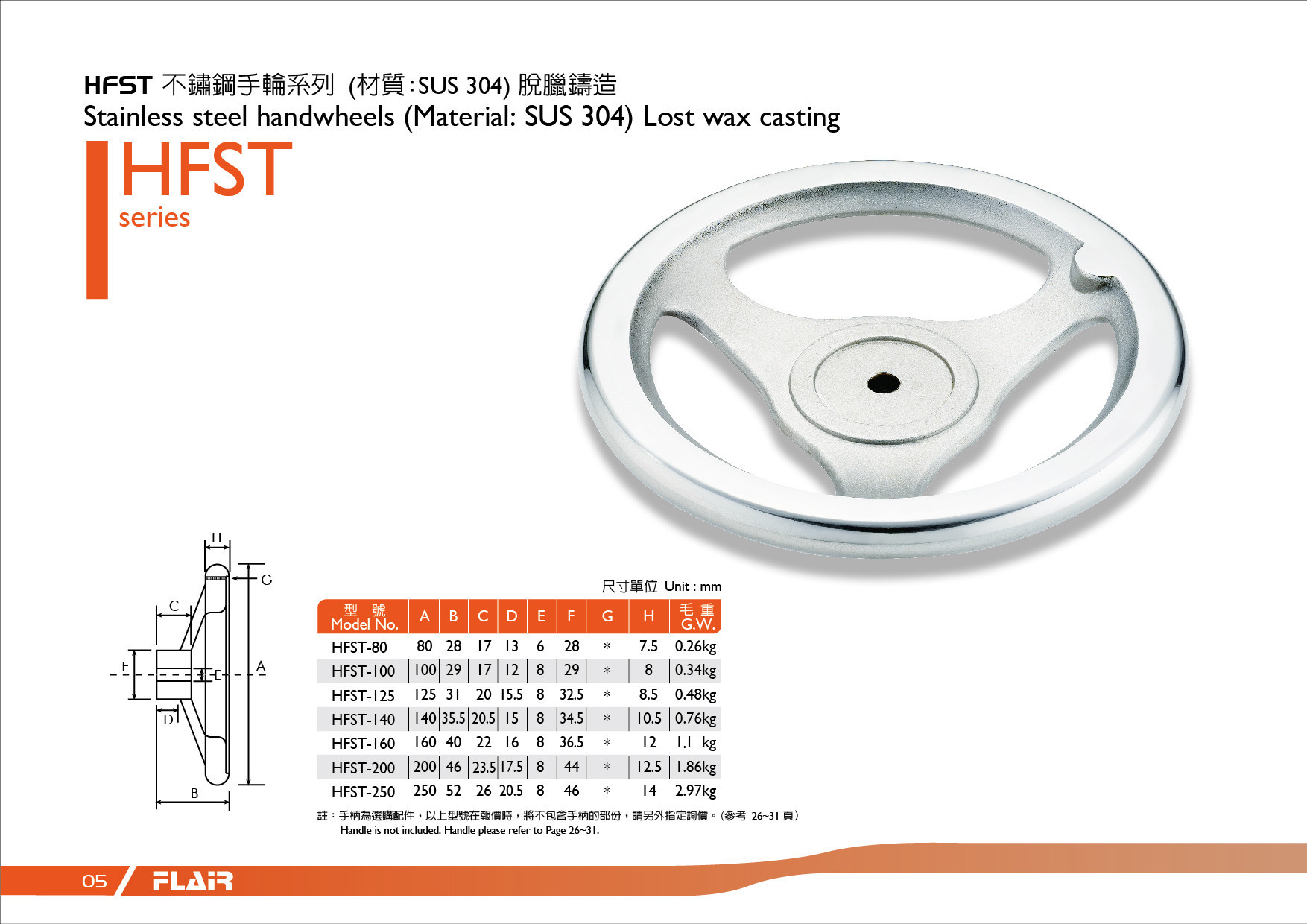 Flair使用脫蠟鑄造技術製造不鏽鋼手輪HFST系列,此系列的材質是不銹鋼(SUS 304)可防銹和抗酸鹼,HFST系列手輪可搭配固定把手、旋轉把手或單購手輪不搭配把手,你好實業擁有穩定且足量的庫存,可以迅速提供您商品,另提供代加工孔徑的服務。