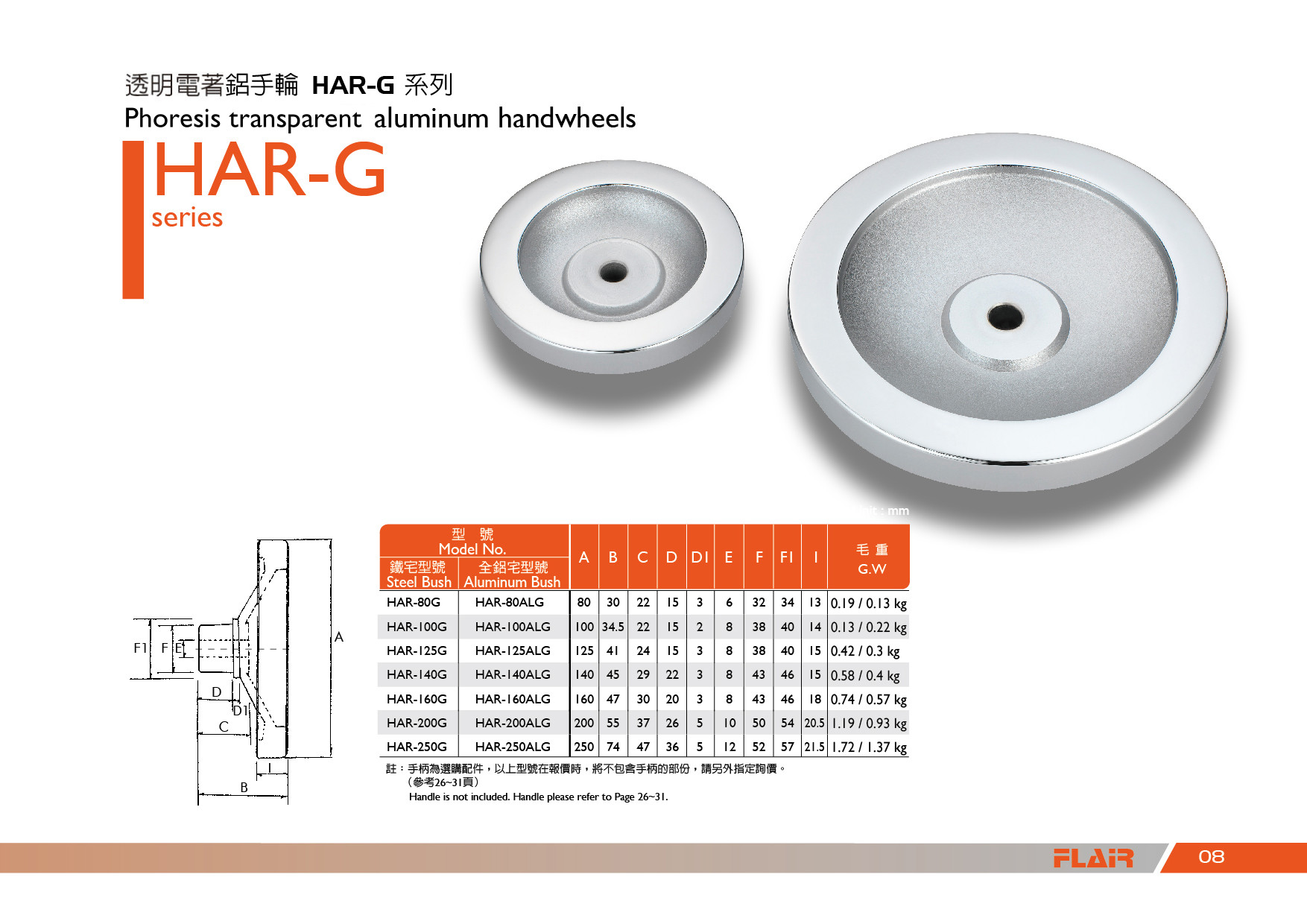 電鍍鋁手輪HAR-G系列有鐵宅型號及全鋁宅型號兩種,客戶可以自己喜好選購。電鍍鋁手輪HAR-G系列這個手輪的設計美觀,電鍍處理後手輪表面呈現亮面效果,將提升你的機器的外觀,手輪邊緣經特殊處理後修飾邊角,呈現圓滑的邊緣,避免使用時產生不適感。